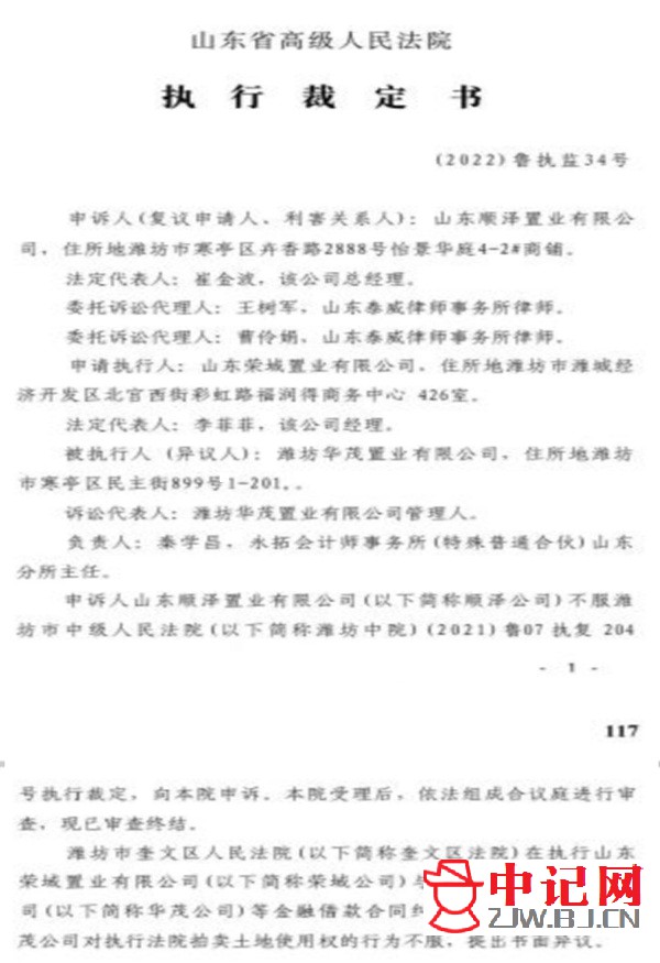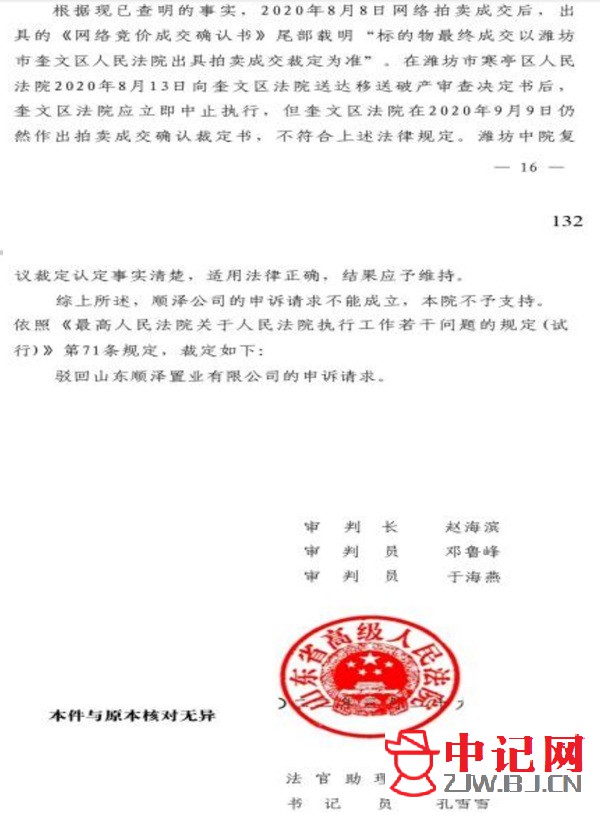 山东省高级人民法院作出(2022)鲁执监34号裁定,最终确认奎文法院执行行为违法,维持了纠错裁定,驳回了买受人顺泽置业的申诉。